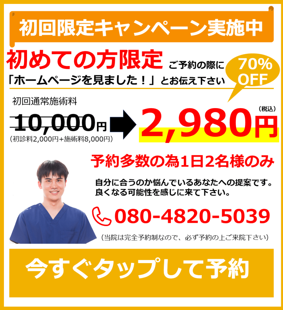 ■初回:約90分(初回は施術前に不調の原因を確認するために問診や検査を十分に行います)