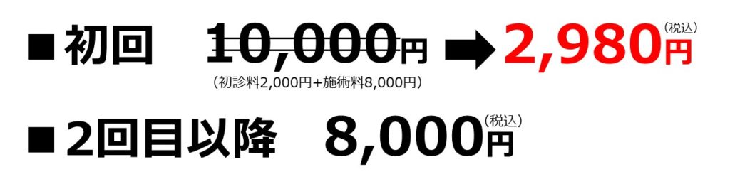 あくまで参考例ですが、症状が特に酷い人の場合は、始めの週は2回施術を受けていただく方が後悔しない結果になります。