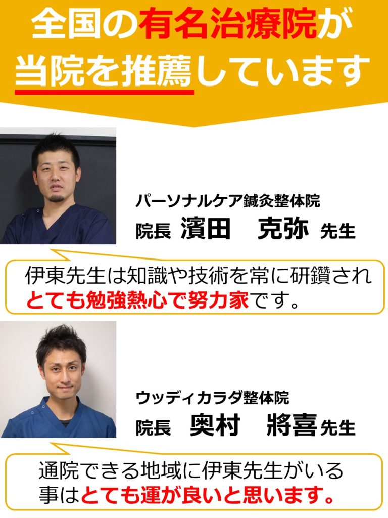 知人の紹介で「伊東先生に診て貰ったら?」と言われ、治療をして頂きましたが、びっくりするくらい痛みが改善され、本当に感謝しております。